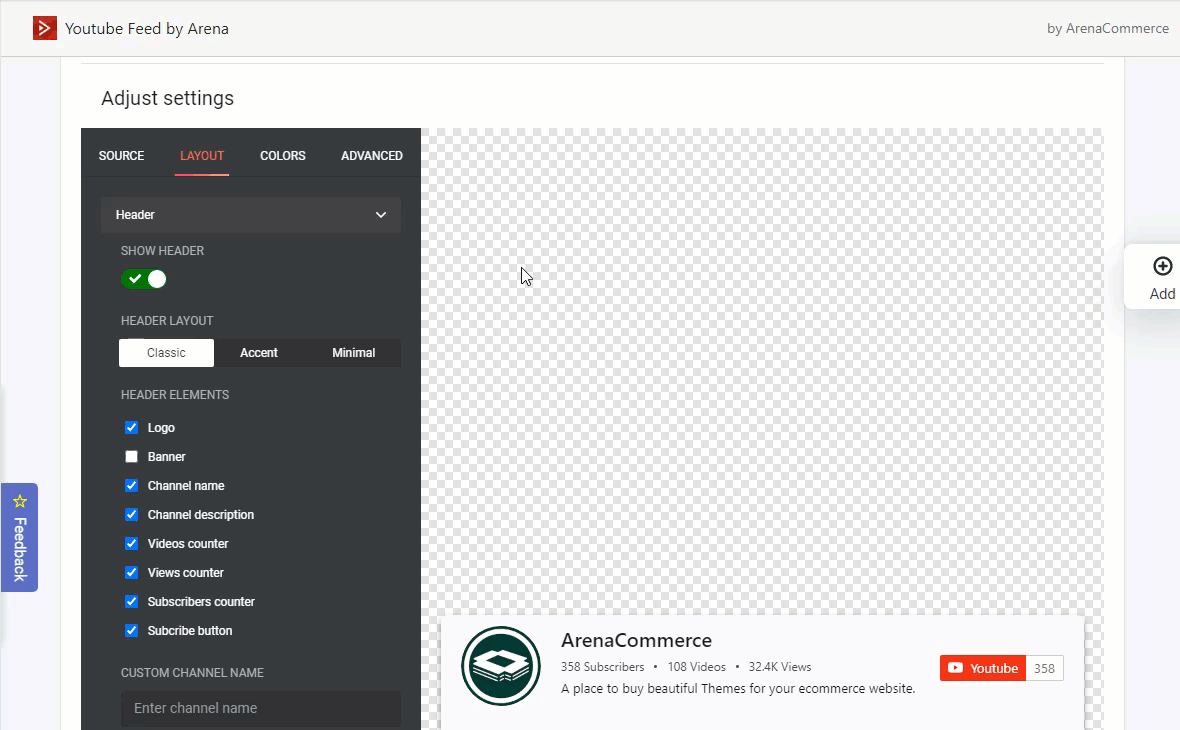 To modify the Youtube Feed's header. We have multiple choices for you, enable or disable the elements, customize how the channel will appear on your store front.